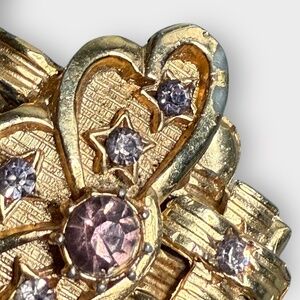 Gold tone fold over clasp bracelet with light purple jewels in the shape of stars.