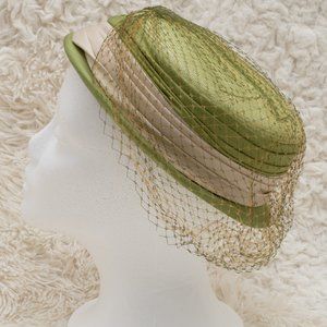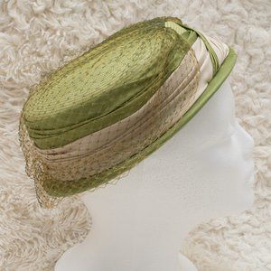1960s green straw hat in a boater style. The hat features cream and green ruching around the base. The hat is overlaid with two layers of matching netting. To secure the hat in place there are two hidden hair clips