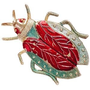 A playful flash of mid-century charm, this enamel beetle brooch brings color and curiosity to any look. Its red and green wings and gold tone legs recall an era when costume jewelry was both whimsical and artful—a small conversation piece that delights at a glance.