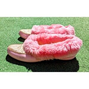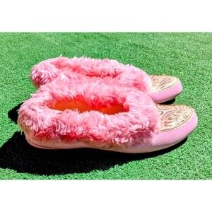 Vintage 1960s Hot Pink Genie Fuzzy Faux Fur Gold Pattern Womens Sz8 Slippers EUC