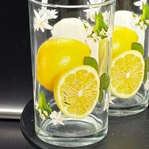 Vintage 1960's Imperial Glass Lemonade Juice Citrus Glasses Set of 4, Very good overall condition. There is some scratching of the decal in a few places. I have these under magnification and used a black background to make them prominent. This is a very nice set.