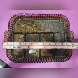 This vintage Indiana Glass serving tray is a beautiful addition to any Mid-Century Modern collection. The rectangular shape and glossy green finish make it a stylish piece for serving fruits or other small dishes. The tray features handles for easy carrying and is dishwasher safe for convenient cleaning.