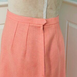 Vintage Early 1960's 2 Piece Matching Suit in pure Irish Moygashel Linen tailored sleeveless top and skirt. Midweight linen in a peachy pink shade with a mod silhouette. Sleeveless tank style blouse features a full button back with linen covered buttons, banded neckline collar, princess style bust seams, mostly a straight cut silhouette. Straight style skirt, fitted with darts at the waist, side zip closure. Tagged Tailored by McMullen, Moygashel linen is crafted of 100% Irish flax fibers and is noted for its durability, ease of cleaning, and resistance to fading. McMullen was a company headquarted in Glen Falls NY primarily known for its shirtdress, carried in better department stores. I have included photos of the interior construction and seam allowances.