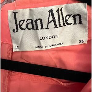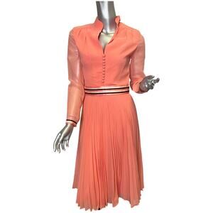Vintage 1960s coral mini dress. Jean Allen label made in London, England. Marked a size 12 or Euro 36, but in modern sizing it fits more like a small/medium. The sleeves are sheer chiffon and the bodice is a mock button down, giving the dress a shirt vibe. The ribbon stripes details at the waist are in corresponding coral, cream and chocolate brown. The skirt is pleated.