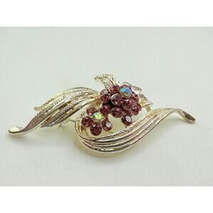 A spectacular unsigned brooch attributed to the renowned designers DeLizza & Elster (D&E), known to collectors as "Juliana." This piece is a quintessential example of their bold and beautiful Mid-Century aesthetic. It features a dynamic floral spray design with textured silver-tone leaves, prong-set with a dazzling array of amethyst purple and sparkling aurora borealis rhinestones. While unsigned, as is typical for D&E jewelry, it exhibits the hallmark "figure eight puddling" construction on the reverse, a key identifier for collectors. A truly stunning statement piece in excellent vintage condition.