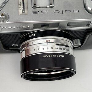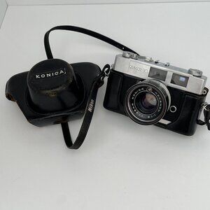 Vintage 1965 Konica Auto S2 35mm Rangefinder Camera with its original black leather case. Non-working / FOR PARTS / Prop / Aesthetics / Display. Shutter does not click.