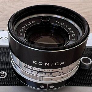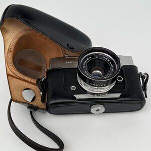 The camera body and lens are in strikingly well-maintained vintage condition; the chrome parts on the camera are bright and clean. The film rewind crank works, the viewfinder is clear, but the shutter doesn't click, we suspect the shutter is jammed. The black leather case is still supple and bouncy with no significant marks inside or out.