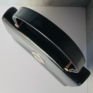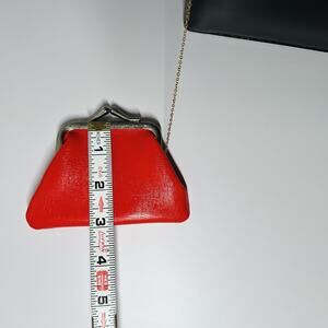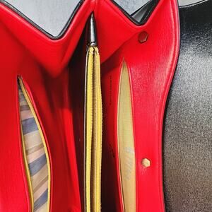 Elegant vintage Koret structured handbag from the 1960s, crafted in black leather with a sculptural two-tone clasp and a detachable coin purse on chain. Interior lined in rich red leather-and-fabric with multiple compartments. A timeless Old Hollywood collectible.