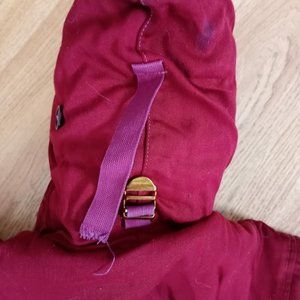 This jacket has been well-loved, but is so hearty that for the vintage-loving northerner it could go at least a few more! This coat has quite a few stains inside and out, the inner lining has begun to clump, there's a tear in the lining near the hood, and the hood fur has worn out around the seam attaching it to the jacket. The hood attachment in the back has snapped, however, it can still be fastened to keep the hood back.