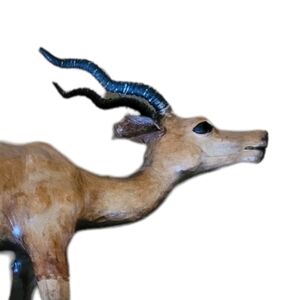 Excellent pre owned condition. Vintage - 1960's Leather Wrapped Impala Statue. Wood base wrapped with leather. Glass eyes. 12" tall 14"wide.