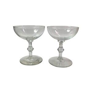 Add a touch of vintage charm to your celebrations with this set of two Libbey Georgian champagne glasses. Crafted in the 1960s, these glasses feature the classic elegance of the Georgian pattern coupled with the distinctive knob stem design, a hallmark of mid-century modern style.