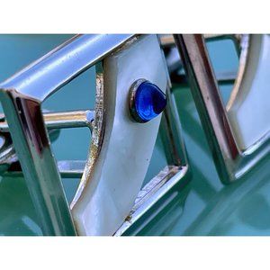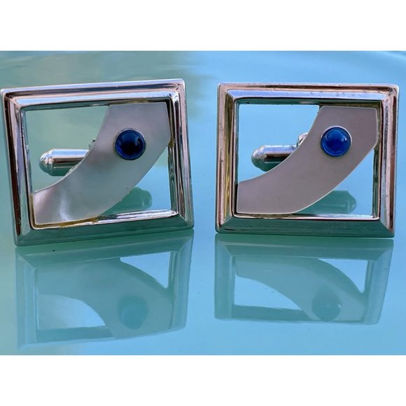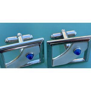 Here for your consideration is a nice pair of vintage mens cufflinks. They are mother of pearl with a lucite blue stone. They measure 1". They are in good wearable vintage condition.