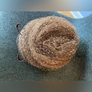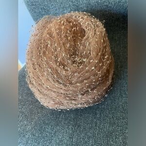 Very good vintage condition. No odors. Narrow brim. Organza with some shimmer. Brownish color. I can picture my grandmother wearing this to church