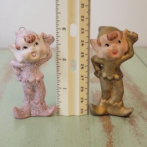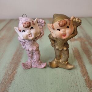 In good to fair vintage condition. *The pink elf has had both feet repaired. It is not super noticeable when displayed.The gold elf is missing its hook that turns it into an ornament. There are a few touches of paint loss. (Pink Pixie bangs)