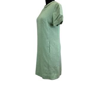 This true vintage 1960s mint green dress is a beautifully preserved piece of mod fashion history. Made from a thick textured polyester and fully lined in soft satin-like fabric, it offers both structure and comfort—no slip required. The dress features short sleeves, subtle shaping at the bust and waist, and a gently flared A-line skirt. With a flattering jewel neckline and back zipper, this dress is easy to wear and effortlessly chic. Ideal for garden parties, spring gatherings, or everyday vintage flair.