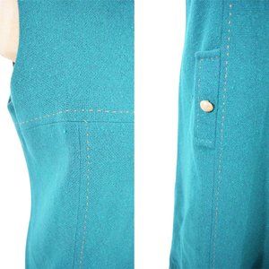 Put on a pair of mary-janes and get ready for a marvelous mod day in this 1960s dress! I love the deep green color on this dress and the unique contrast of the orange stitching and faux waist pockets with gold non working buttons. Vintage dress zips up the back with a metal zipper and is only partially lined around the neck and underarms.