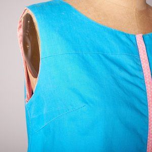 The dress is in great condition. It is turquoise with pink and white polka dot ruffles and trim. Zips up the front with a metal Swift zipper. There is a hip pocket on one side. It measures 49 cm across chest, 50 cm across waist, 54 cm across hips and 94 cm long.