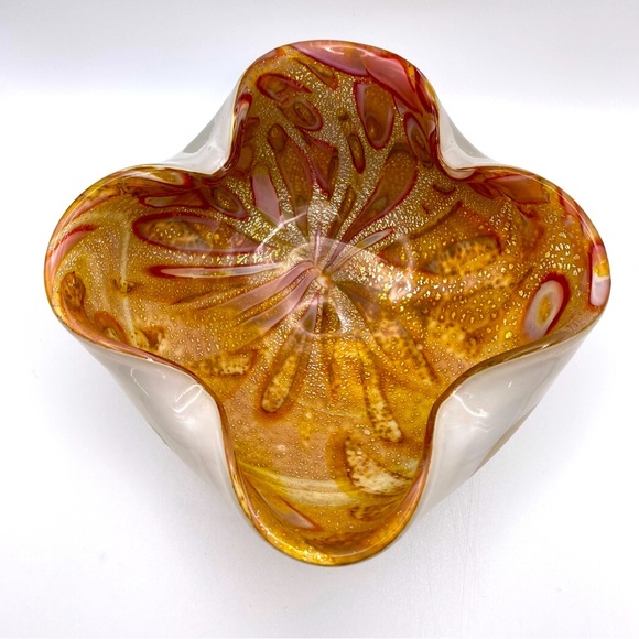 Vintage 1960s MCM Murano Hand Blown Pink, Yellow, and Gold Flake Pinched Confetti Ashtray Glass Art Dish