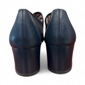 Red, white and blue checkered, braided pattern on upper front portion of the shoe