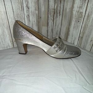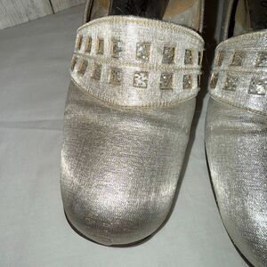 Stunning vintage Nanette Originals silver heels from the 1960s, featuring a shimmer fabric finish, elegant square rhinestone detail, and a chic block heel. True Old Hollywood glamour — perfect for weddings, parties, or collectors who love retro sparkle and mid-century elegance.