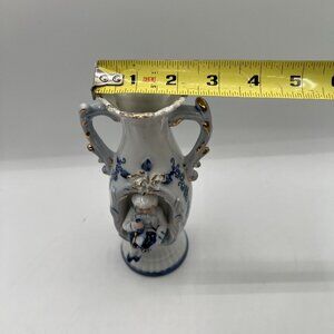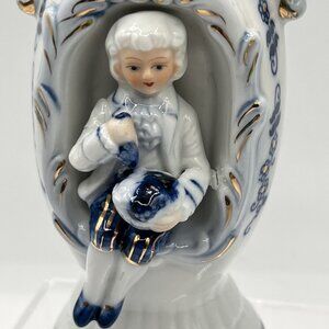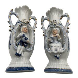 Vintage 1960s Norleans 2 Victorian Style Porcelain Figurine Vases Made In Japan Blue Gold Trim Boy Girl