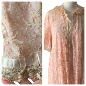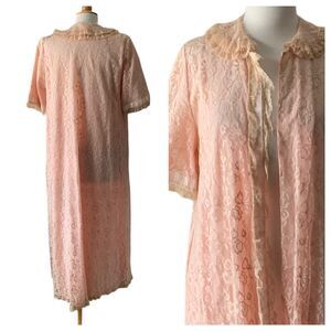 Vintage 1960s Odette Barsa Pink Lace Maxi Duster Robe Royalcore Regencycore. Snap closure.