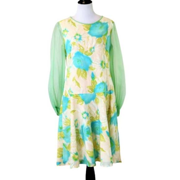 Vintage 1960s Pastel Floral Printed Drop Waist Dress With Chiffon Sleeves Large