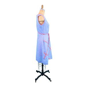 A 1960s vintage dress in a pale blue chambray with contrasting red and white checkered trim around the neck, sleeves, on the matching belt and across the front of the skirt. Vintage dress zips up the back and is on the sheerer side so I recommend wearing a slip underneath.