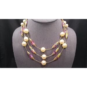 Vintage 1960s Pink Crystal Necklace 3 Strand Aurora Borealis Faux Pearl Beads