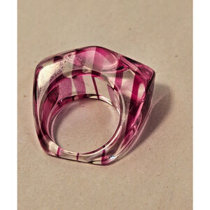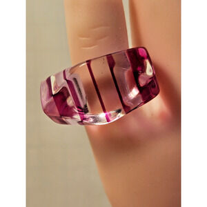 This vintage 1960's pink striped Lucite ring in size 7 is a statement piece of fashion jewelry. The ring features a retro angular style with a unique pink color and striped pattern, making it a eye-catching accessory for both men and women. Made from Lucite, a durable yet lightweight plastic material, this original piece is perfect for adding a pop of color and vintage flair to any outfit. Please look at all the photos as they are part of the description. Please email with any questions.