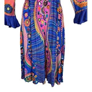 Features: This is a classic iconic psychedelic style 1960s romper. Light weight polyester fabric. Expandable waist band. long sleeves with ruffle cuffs. V neckline with ruffle detail. At the knee length palazzo flowy shorts style bottom. Front zip closure for easy on and off.