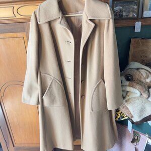 Vintage circa 1950s or 1960s 100% pure wool coat. Collared with tailored look details. Plastic buttons. Two oversized pockets on front. Fully lined in satin material. Camel light brown in color. Measures to a modern size 10.