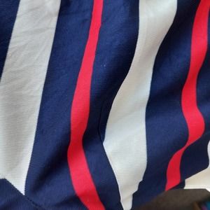 Vintage cream, red, and navy button-up short-sleeved knit jacket. Well-made and in good vintage condition. Just two small stains, not noticeable.