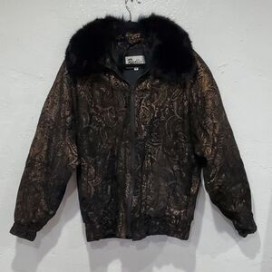 Vintage 1960s Radlee Patterned Leather Coat with Genuine Fox Fur Collar Sz M