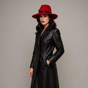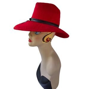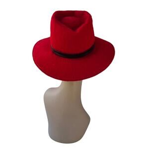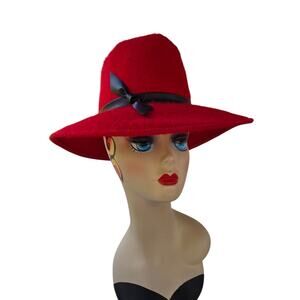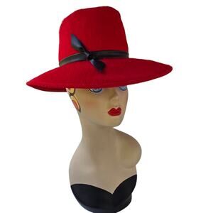 Stand out in this stunning vintage red mohair and wool hat, believed to be a Joquil Original from New York. Features a soft brushed texture, structured wide brim, and sleek black leather tie band with bow detail. Elegant and bold — a true statement piece with mid-century flair.