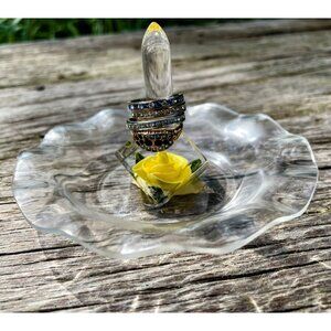 Here for your consideration is a nice little reversed carved Lucite Yellow rose ring holder trinket Dish. The dish measures 4 3/4" in diameter. The ring holder is 2.25" tall. This is in good usable vintage condition. Rings not included