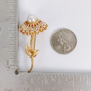 A vintage brooch that blooms with character, this piece pairs a luminous faux pearl center with radiant rhinestone petals in a graceful daisy form. The warm gold tone finish and curved stem give it a refined, timeless presence that feels both nostalgic and elegant.