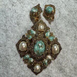 The set consists of a large 3" x 2 1/4" pendant enhancer/brooch and 1 1/8" x 7/8" clip earrings. The faux pearls and faux turquoise are set in an antique gold frame