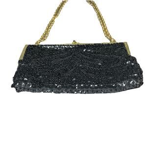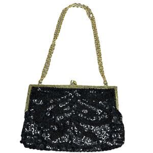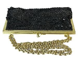 Vintage 1960s Sequined Evening Bag Black Beads Gold Framed Clutch Kisslock Chain