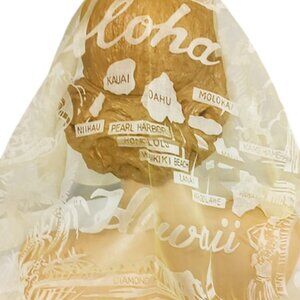 Hawaiian cities, landmarks, palm trees, a hula dancer, flowers, shoreline and waves along the border is the design of this square scarf.