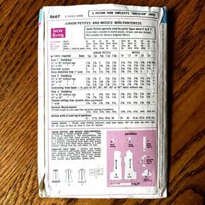Womens Mini-Pantdress: Mini-pantdress has back zipper and high round neckline. Sleeveless V1 features rick-rack and daisy medallion trim. V2 features contrasting front band with button trim. V2 & V3 have short set-in sleeves. V3 with pleated ruffling trim has self fabric tie belt. "How To Sew" Pattern.