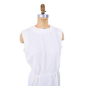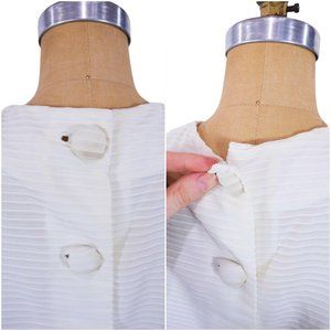 Kick spring into gear in this cream 1960s dress! This sleeveless dress has a horizontal stripe texture to the sheer fabric, a fitted waist and kick pleat. Vintage dress is unlined, has metal zipper half closure to back waist and then button closures on the bodice.