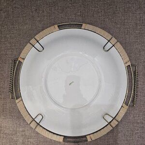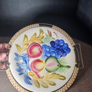 Vintage 1960s Souritsu Akechi Japan hand painted serving plate the plate a creation of Souritsu Akechi, Japan stands out not only for its Japanese craftsmanship, but also for its striking hand painted design. At its center an embossed fruit and greenery motif comes to life in vibrant eye catching colors. This artful motif adds a touch of retro elegance to any setting, making it an ideal decorative and functional piece. What sets this unique piece apart is the accompanying gold metal holder with gold spring handles crafted in a mid century style. This holder transforms the beautiful plate into a practical serving piece for an added touch of kitschy charm, decoration cream colored texture plastic wrapped covers each quarter of the metal holder enhancing its unique appeal. This vintage treasure is in remarkable condition for its age, free of any chips, cracks or rusting. Marked on the back Japan. Some very very mild crazing on the plate. The plate when it is in its holder measures 12.25 inches in width handle to handle. Plate alone measures 10.25 inches by 1.25 inches high. Non smoking pet free home.