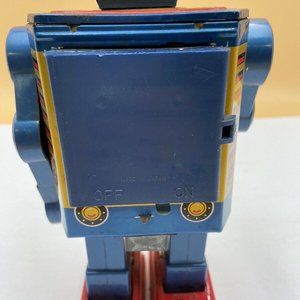 Crafted from high-quality tin, this pre-1970 robot has stood the test of time and remains in excellent working condition. With its vibrant color scheme and realistic features, it promises to be a great addition to any collection. Don't miss out on the chance to own this fantastic piece of toy history!