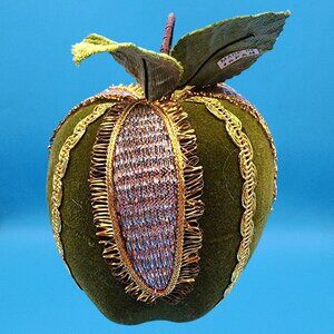 A charming mid-century Christmas ornament featuring a tiny spun-cotton chenille elf tucked inside a flocked green apple. Beautifully accented with gold metallic trim, velvet leaves, and multicolor woven panels, this whimsical piece captures the magic of 1960s Japanese Christmas décor. A delightful addition for collectors of elves, fruit ornaments, and MCM holiday treasures.