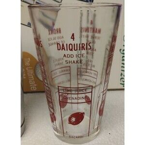 this cocktail mixer Includes Recipes for five classic drinks: Bronx, Manhattan, Daiquiri, Martini and Orange Blossom. This 16 ounce glass makes four of each cocktails, or, let's see, two doubles of each.