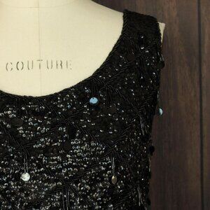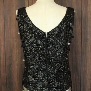 Gorgeous vintage sweater top from the 1960s. Black wool lining covered in sequins and black beads with fringe along the bottom. Tank style, cropped, slightly boxy shape, metal zipper down the back. Label reads: Orbach's, made in Hong Kong, 100% wool. Volup size but do check the measurements below.