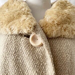 vintage 1960s beige wool coat with faux fur collar. Very 60s! Three big buttons to close, pockets at side. Best fit Medium