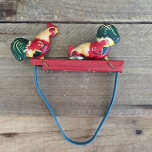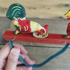 Vintage 1960s Tin Litho Chickens Eating Toy.