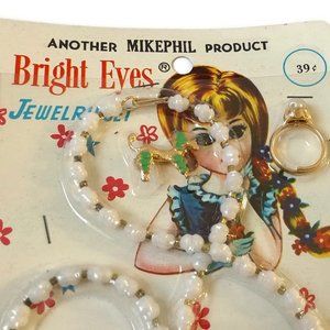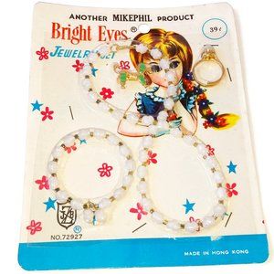 As a vintage jewelry set, this Bright Eyes set from the 1960s is a rare find that collectors won't want to miss. It is in it's original packaging, never opened from Hong Kong. New Old Stock. The set includes a poodle pin, ring, necklace, and bracelet. Made by MikePhil, this piece is a valuable addition to any collection. It is categorized as vintage toys but it makes a nice addition to a vintage jewelry collection as well. Circa 1960's. Size of the header card is 6.5" x 5". This would make a exciting gift for your young one.